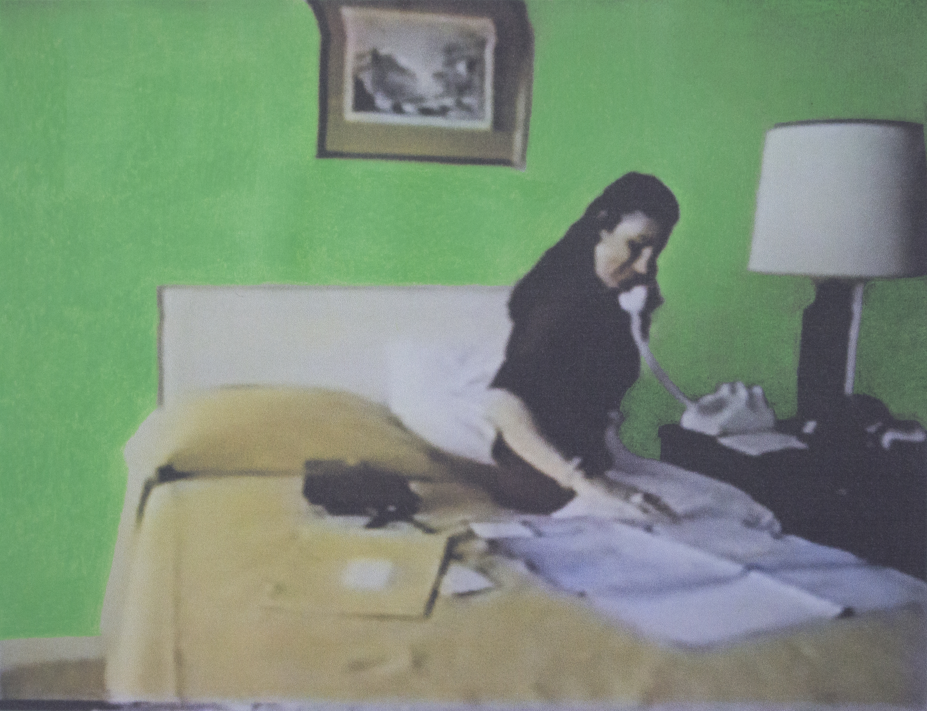 It’s Natural is a series of colored inkjet printed images altered with green pencil. The series of images are film stills subtracted from An American Family, the first reality show that aired in 1973. Throughout the show you follow seven different family members in their daily routines. In It’s Natural you only see the mother. She wanders through different settings: she holds the telephone against her ear in a hotelroom, looks into a swimming pool, she lays down in a garden chair or looks through a window, she passes by the outside of a building or looks through an opening in the wall. In each image something in the setting has been modified. An element has been turned green. It is as if that colored element tries to cover up something that is already present or it accentuates something that is not yet there. It is unclear whether the mother is aware of this or not.