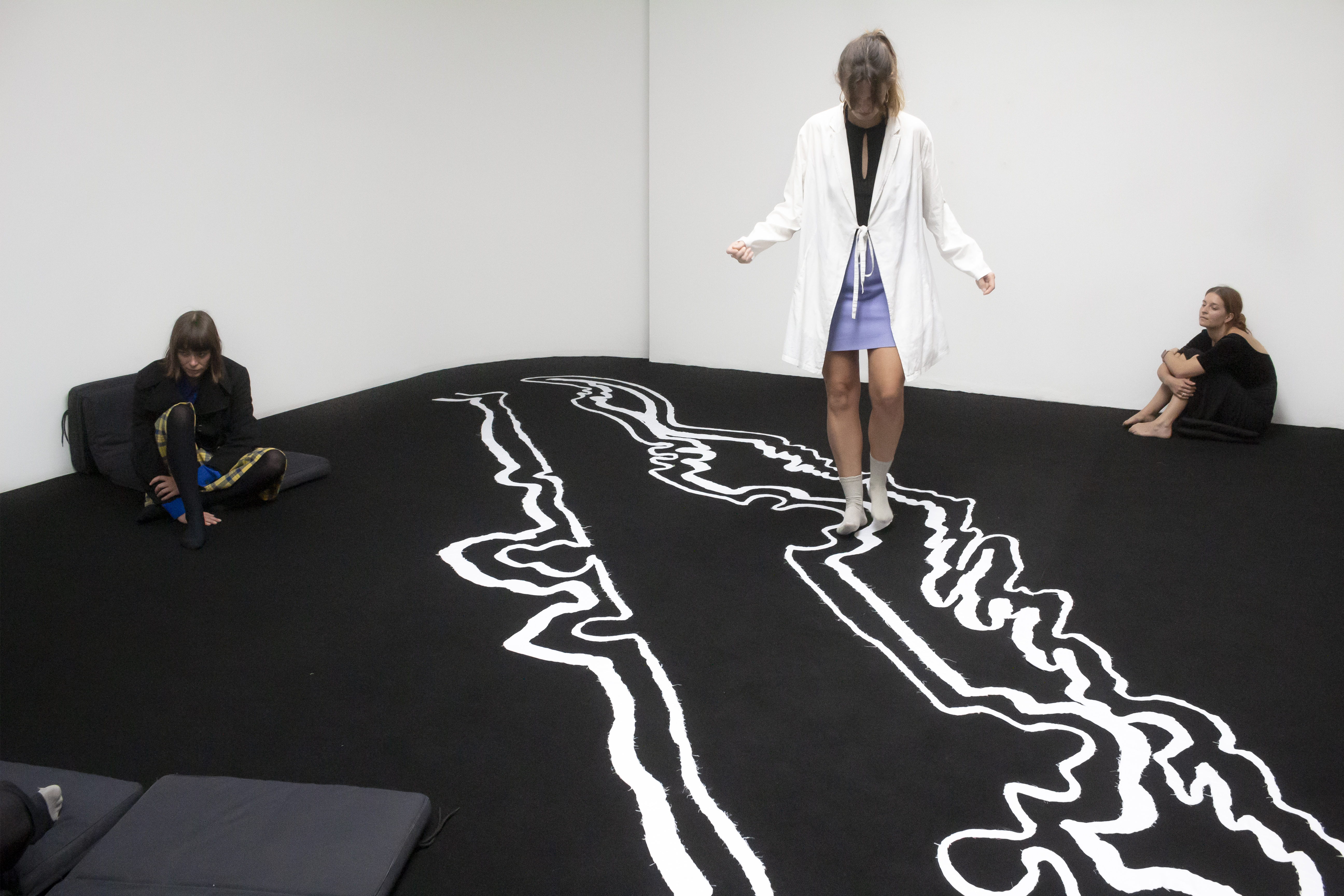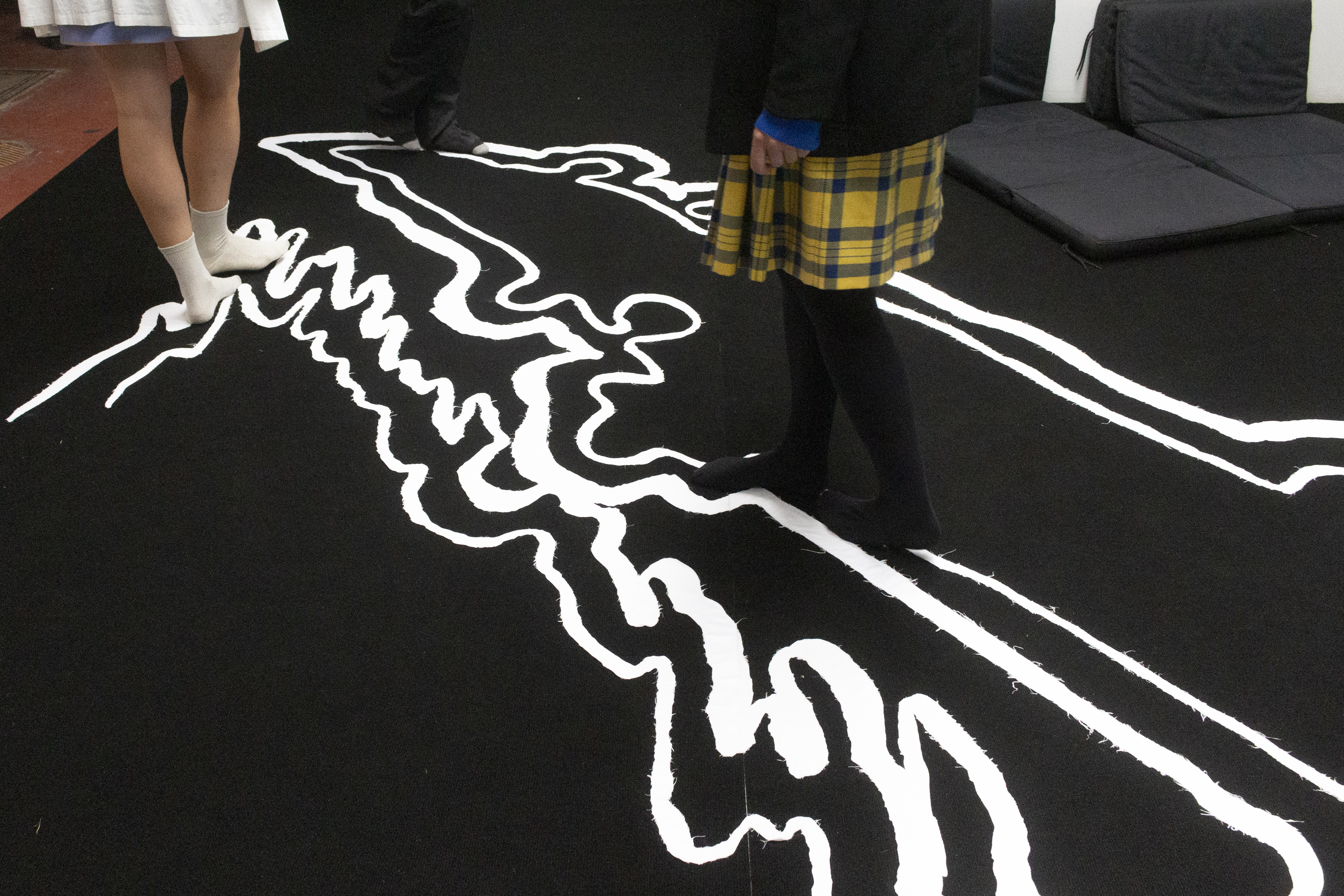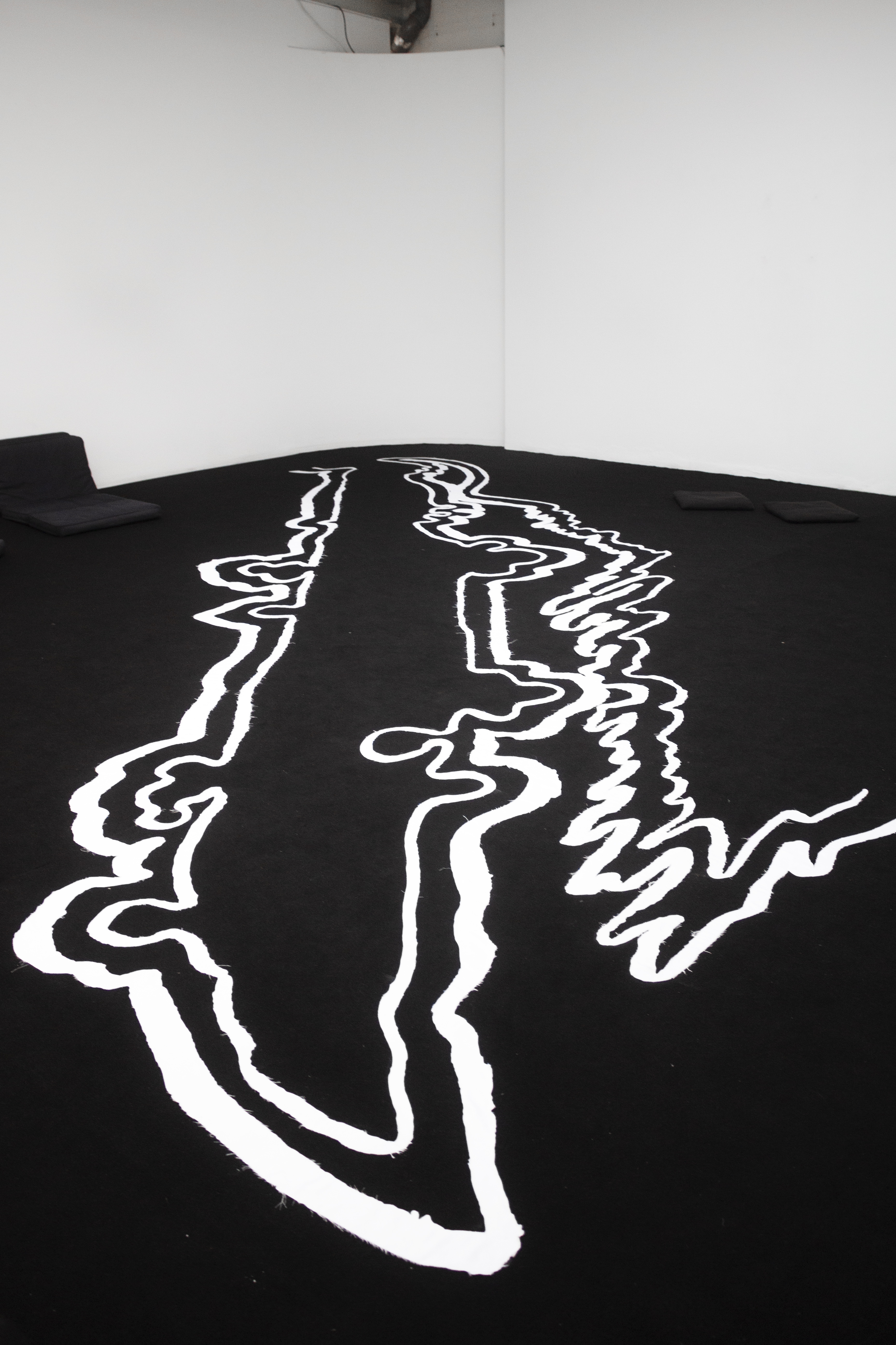 defend. In the installation, the knife is stretched out across the floor in the form of a stitched carpet, inviting