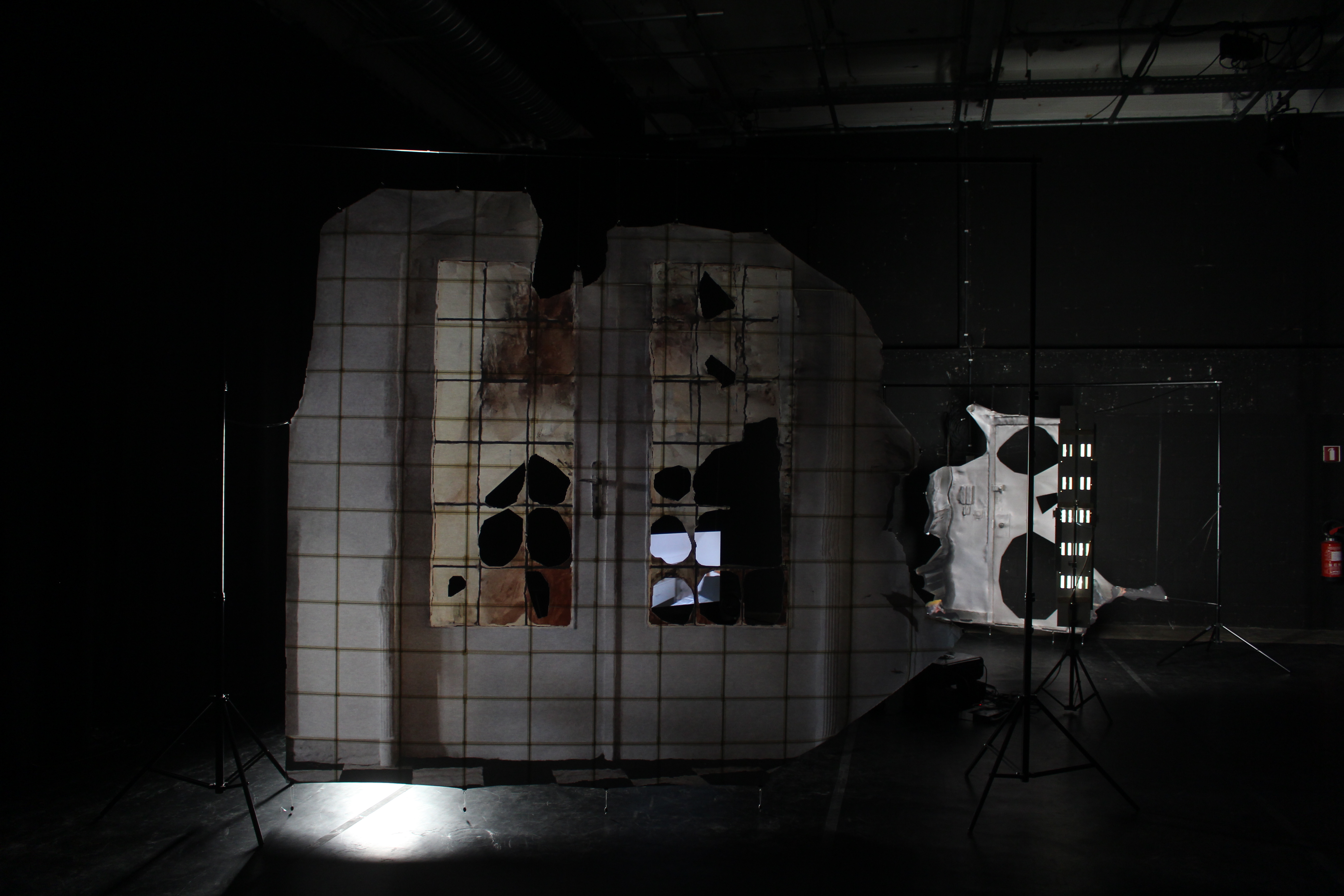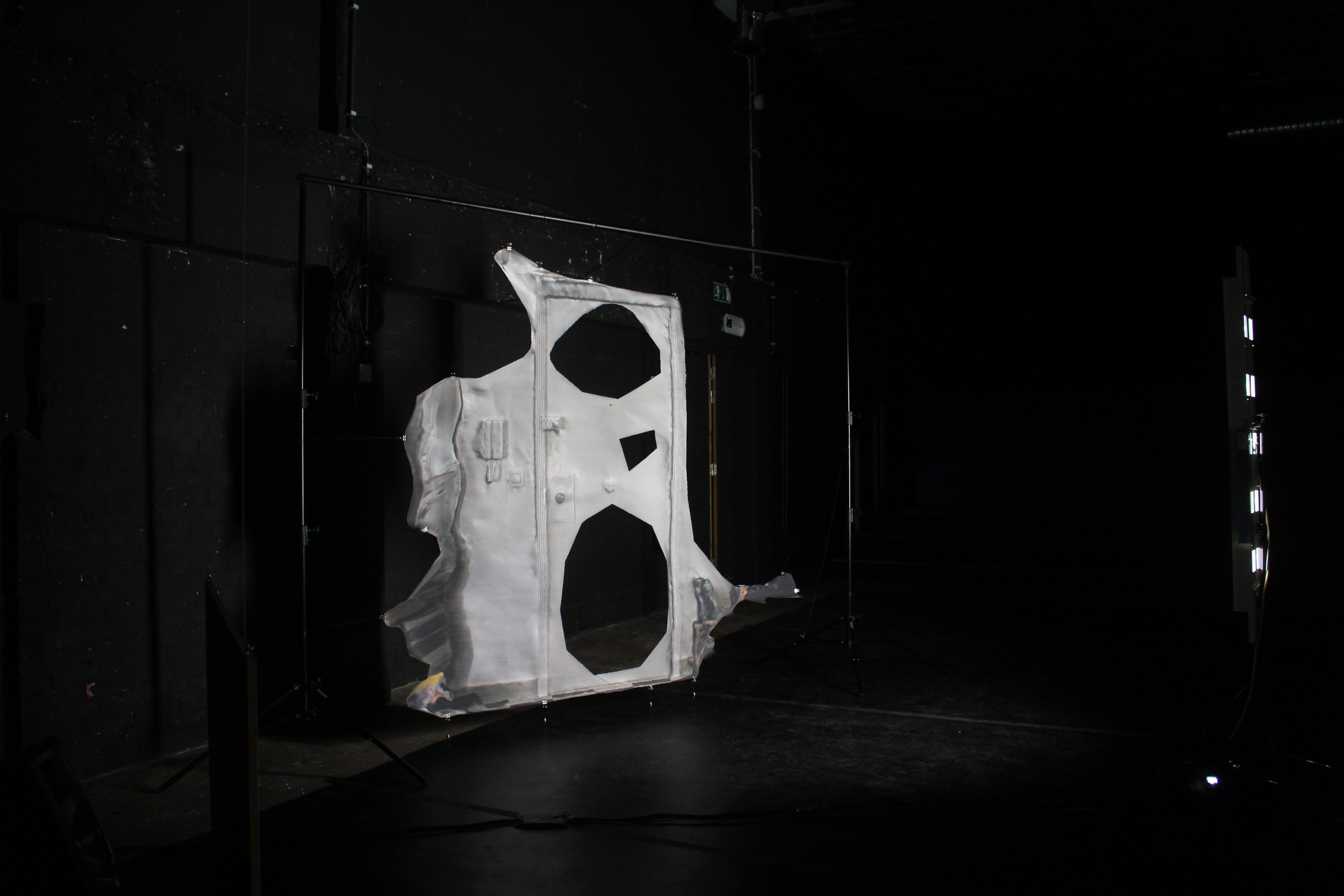 aluminium photographic backdrop, self-made bank lights on tripods, stereo and headphone